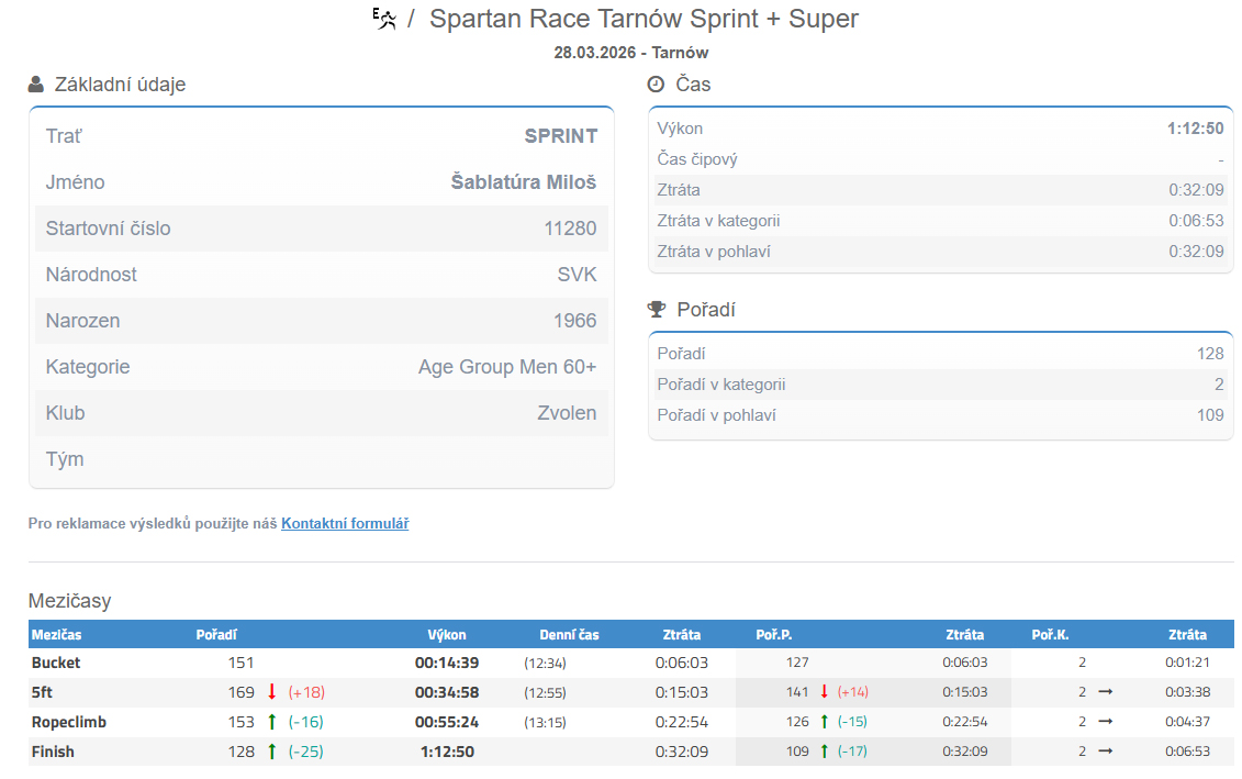 Tento rok som prešiel do poslednej kategórie v SPARTANovi 60+ a v cieli z toho bolo skvelé 2. miesto v kategórii a celkovo 128 miesto z 369 účastníkov. Potešilo ma to o to viac, že som bol tretí najstarší pretekár. Hneď po dobehu sa poriadne rozpršalo, ale čakanie na vyhlásenie mi nevadilo – medaila a stupne víťazov za to stáli. Behať pre zdravie je super, ale som súťaživý typ a takéto bonusy jednoducho milujem!